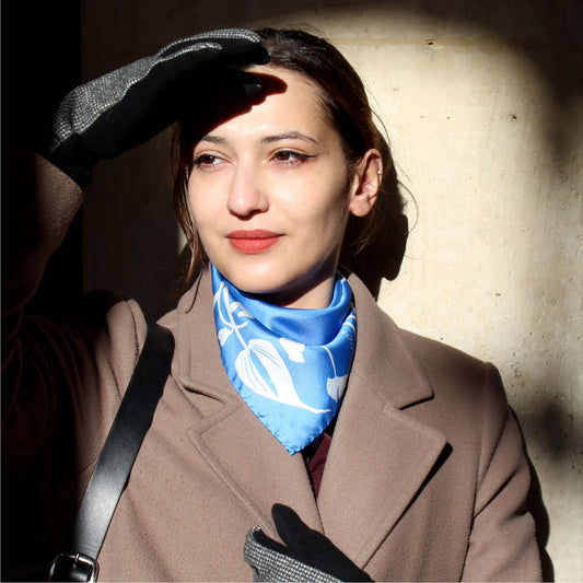 Foulards et accessoires en soie dessinés à Paris, fabriqués entre Italie et France. Des motifs floraux exclusifs et modernes, dessinés et développés avec savoir-faire par la créatrice de la marque, qui transforment chaque pièce en un véritable bouquet à porter.