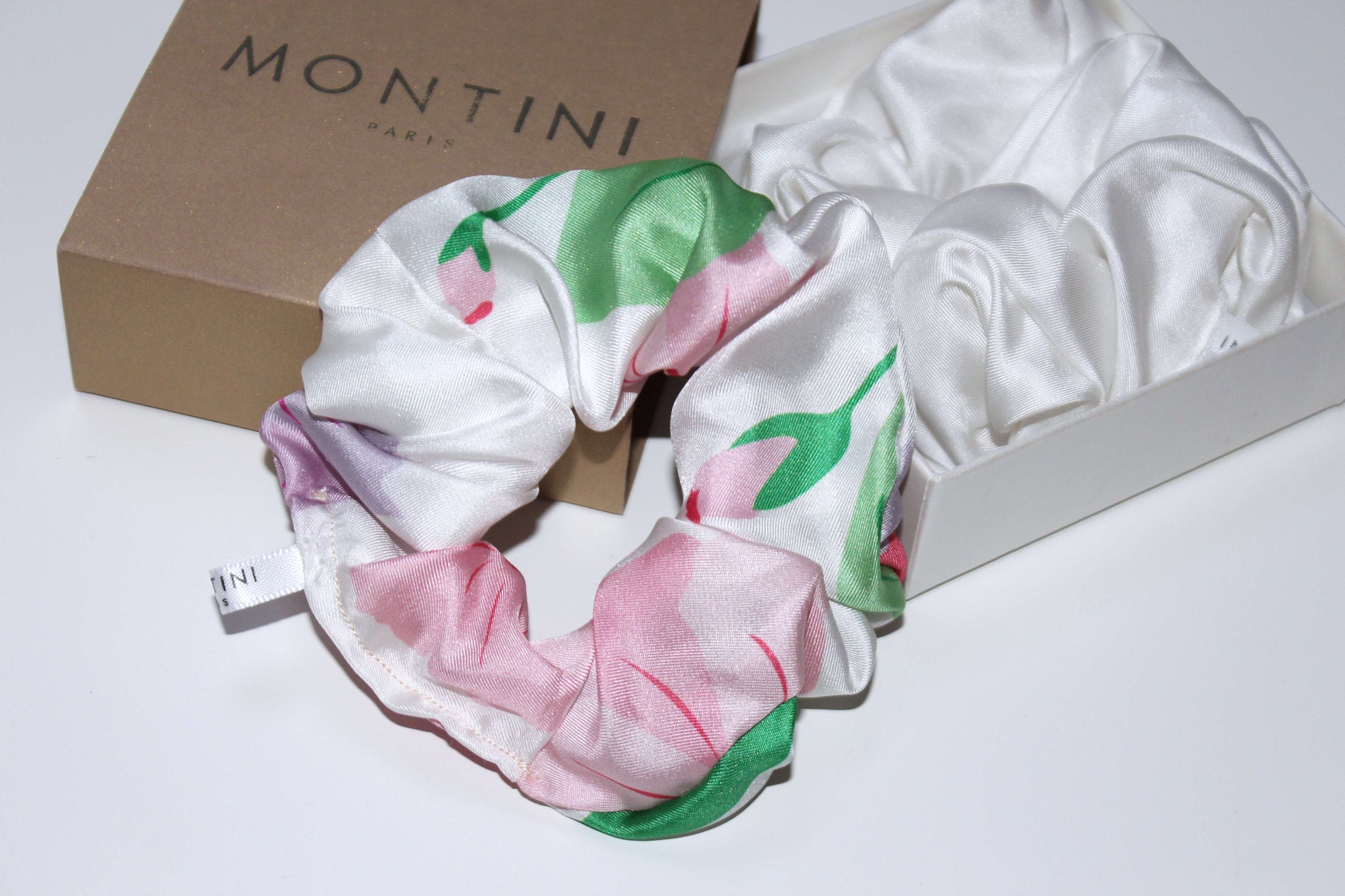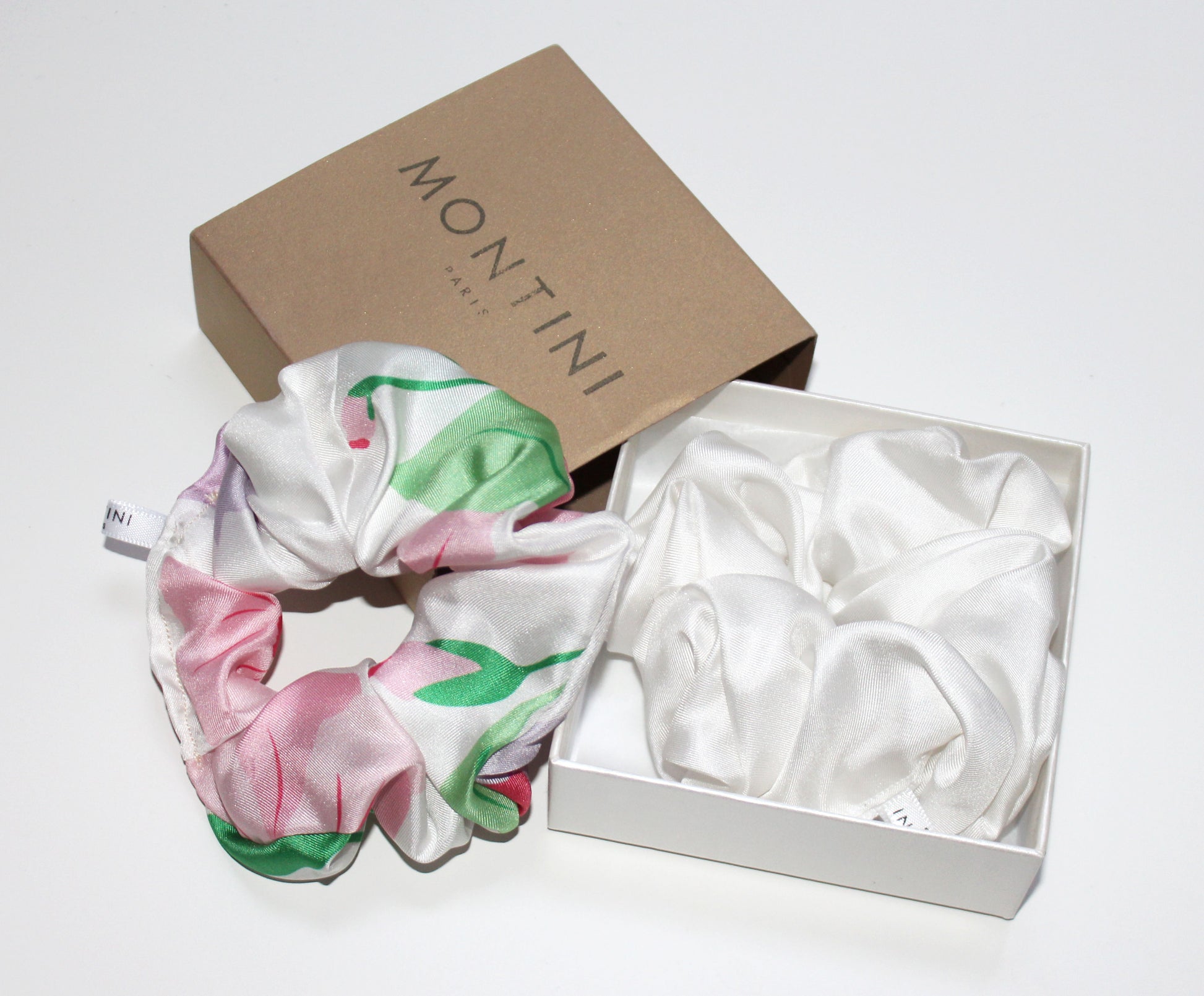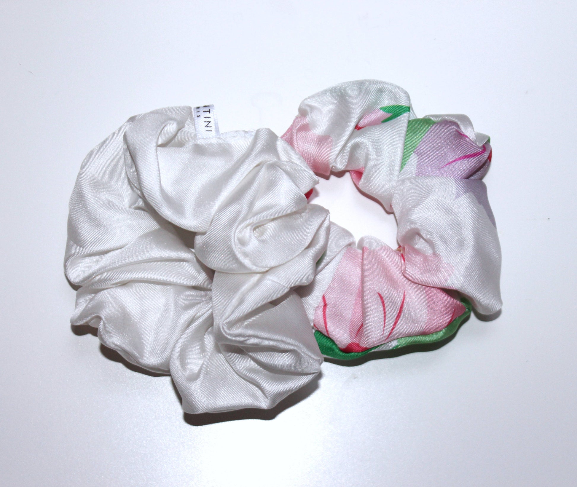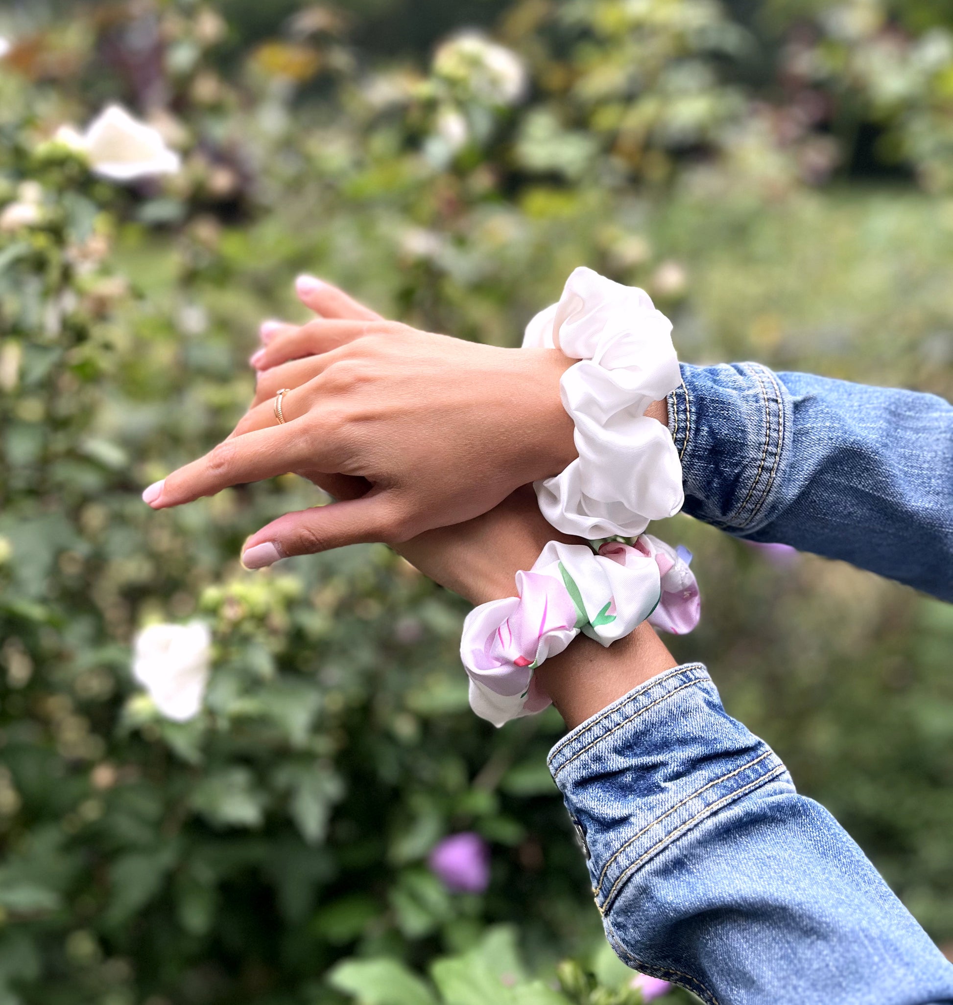 A new set of scrunchies that combines the texture of the Hibiscus collection with the neutral shade of a white silk scrunchie, the latter made from fabric scraps from our latest production.